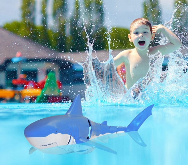 A fekete távirányítóval és kék gombokkal könnyedén irányíthatja a cápa mozgását.