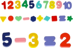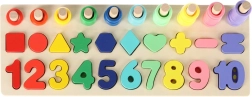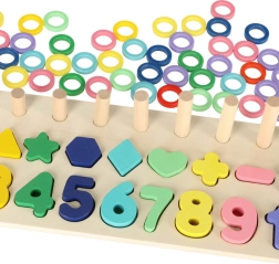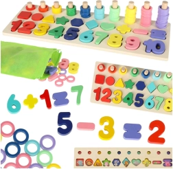 Ez a montessori készlet ötvözi az építés örömét a tanulással. A gyerekek a fa geometriai alakzatokat és a számokat a megfelelő nyílásokba illesztik, miközben a pálcákra színes gyűrűket fűznek, melyek száma megegyezik a vonatkozó számjeggyel. Az áttekinthető faalapnak köszönhetően a tanulás természetes és szórakoztató.