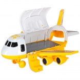 Nagy szállító repülőgép gyerekeknek, amely fedélzetén három építőgépet és egy közlekedési táblakészletet szállít. Nyitható rámpát, oldalsó hozzáférést, LED fényhatásokat és valósághű hangokat kínál, amelyeket négy gomb vezérel. A levehető szárnyaknak és a praktikus fogantyúnak köszönhetően könnyen hordozható és tárolható.