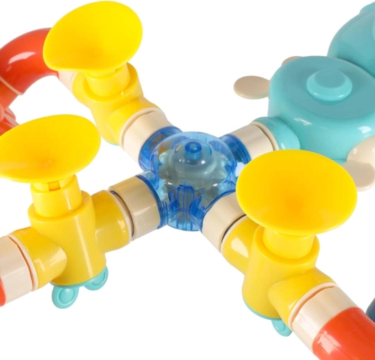 A vidám fürdőjáték építőkészlet csövekkel és tengeri állatokkal minden fürdést kreatív játékká varázsol. Önts vizet a felső tölcsérbe, és figyeld, ahogy a csöveken áramlik, beforgatja a kerekeket, és vízeséseket, illetve kis szökőkutakat hoz létre. A tapadókorongoknak köszönhetően a játék könnyen rögzíthető a kádhoz vagy a csempéhez. Fejleszti a finommotorikát, ok-okozati összefüggések megértését tanítja, és támogatja a kreativitást a saját vízi pályák építése során.