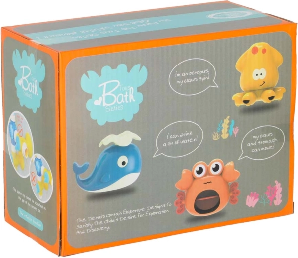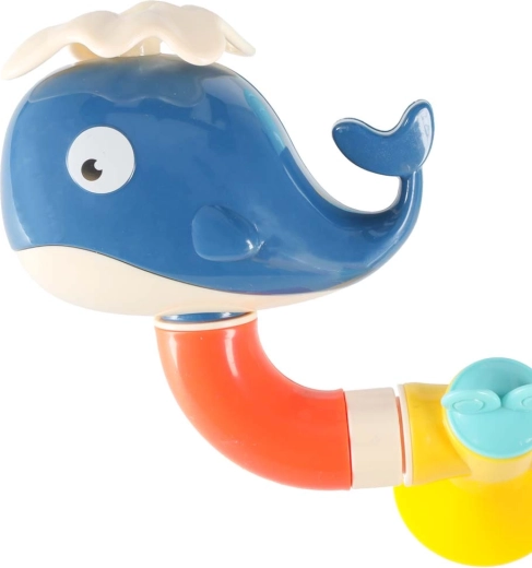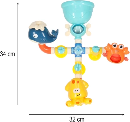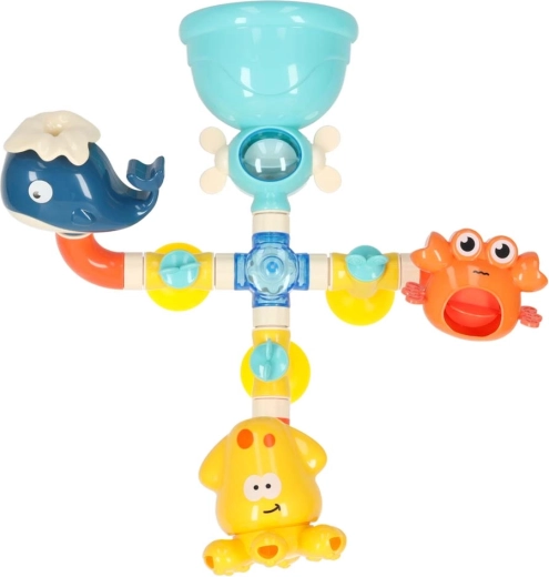 Ez a színes vízi pálya a kádba tölcsérekből, csövekből és vidám kiömlőkből áll, bálna, rák és polip formában. A gyerekek egyszerűen felülről vizet öntenek, és figyelik, ahogy az a rendszeren átfolyik, megforgatja a kerekeket, és különböző nyílásokon szökőkútként vagy vízesésként távozik. A biztonságos anyagok és a lekerekített élek ideálisak a mindennapos vízi játékhoz.