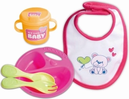 Tányér, kiskanál, villa, füles bögre és textil előke – minden egy csomagban a baba valósághű etetéséhez.