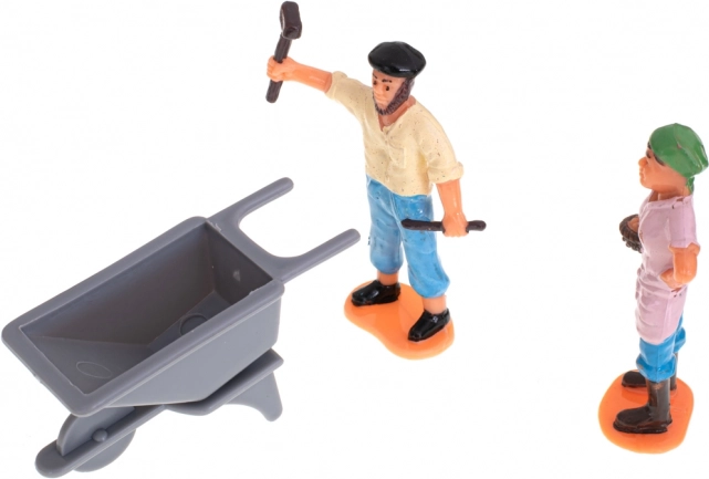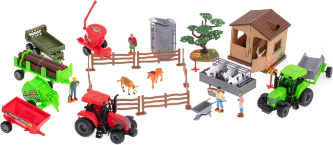 Összehajtható istálló, 2 traktor, 3 pótkocsi/felépítmény (pl. vetőgép, bálázó, bálaszállító pótkocsi), siló, fa, 8 fa kerítéselem, 8 csatlakozó (alap) a kerítéshez, 6 téglaelem, vályú/itató, gazda figurák, állatok, figyelmeztető táblák és további kiegészítők