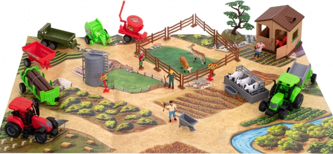 Fedezd fel a nagy játékkészletet a kis gazdáknak: a tanya állatokkal és mezőgazdasági gépekkel mindent kínál órákon át tartó kreatív szórakozáshoz. A csomag tartalmaz egy összehajtható istállót, 2 traktort cserélhető pótkocsikkal, állatkákat, kerítést, fát, gazda figurákat és további kiegészítőket. A nagy 100 × 70 cm-es játékszőnyeg valósághű környezetet teremt, és támogatja a képzeletbeli játékot és a kreativitás fejlődését.