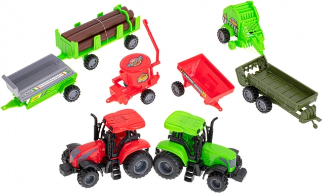 A készletben 2 traktor és különféle felépítmények találhatók – bálaszállító pótkocsi, vetőgép/kaszáló vagy bálázó. Kiváló a valós gazdasági munkák szimulálásához.