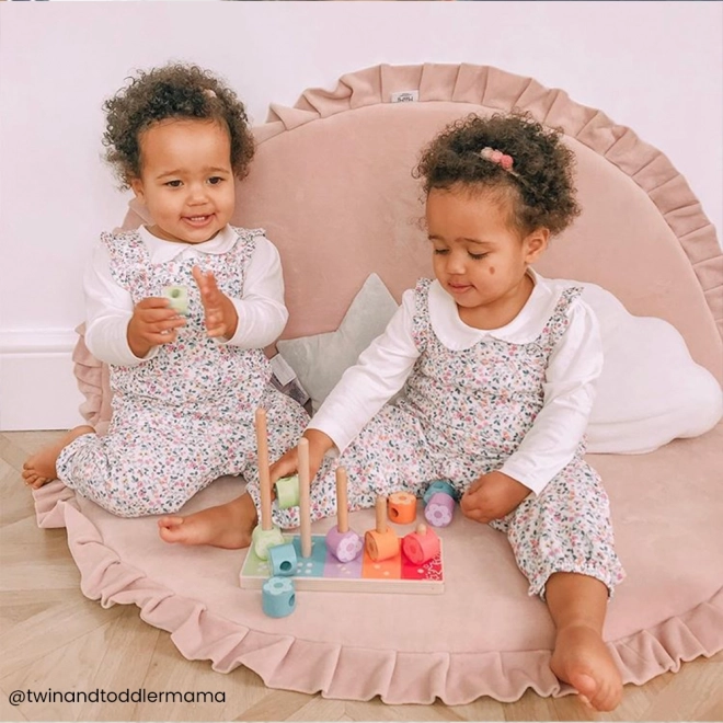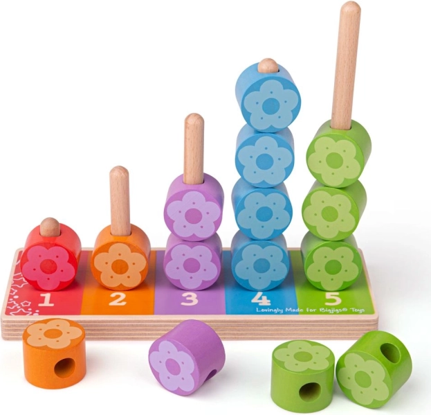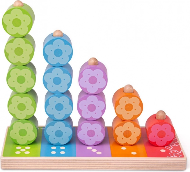 Minden oszlopnak megvan a saját száma és színe, így a gyerekek könnyen megértik a párosítás és a mennyiségek elvét. A virág alakú elemeket a kicsi kezek is kényelmesen meg tudják fogni, és ösztönzik az önálló játékot, valamint a közös felfedezést a szülőkkel.