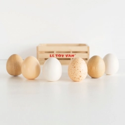 A LE TOY VAN fa gazdasági tojásai ládikában tökéletes kiegészítők a gyerekkonyhába és a kis boltba. A 6 élethű tojásból álló készlet masszív kaucsukfából, praktikus fogantyús ládikában, támogatja a szerepjátékot, fejleszti a finommotorikát, és segít megismerni az egészséges táplálkozást. Fenntartható anyagokból készül és vízbázisú, nem toxikus festékekkel van festve.