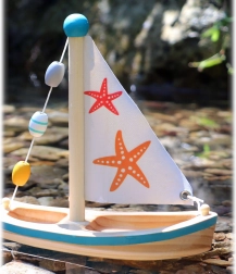 Ez a minőségi Small Foot vízi játék örömet szerez a gyerekeknek a szabad játék során vízben és azon kívül is. A sima felületű fa hajótest és a tengeri csillag motívumos textil vitorla biztonságos használatot és vonzó megjelenést biztosít. Úszó kialakítása ideális a kádba, a medencéhez vagy nyári vizes játékokhoz a természetben.