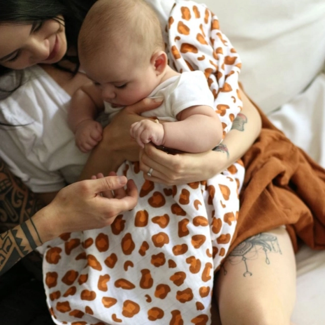 A bőséges 120 × 120 cm-es méretnek köszönhetően ideális pólyázáshoz, takaráshoz és a mindennapi gondozáshoz otthon és útközben is. A stílusos fehér leopárd minta örömet szerez azoknak a szülőknek, akik praktikus, modern dizájnú kiegészítőt keresnek.