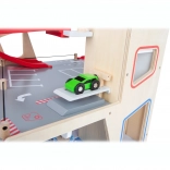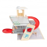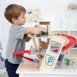 Ez a prémium parkoló kiváló minőségű rétegelt lemezből készült, három gazdagon felszerelt szinttel, melyeket egy működő lift és két sima rámpa köt össze. A gyerekek parkolhatnak, tankolhatnak, tölthetnek, moshatnak és javíthatnak – mindezt egy helyen, élethű elemekkel és nagyszerű játszhatósággal.