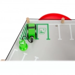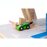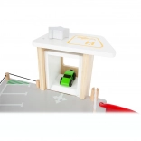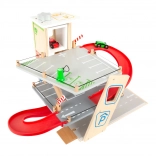 A szett része 2 kisautó, kút, töltőállomás, emelőrámpa, autómosó kefékkel és három sorompó. A szinteken gumis védőkorlát óvja a járműveket a kieséstől, a felületek pedig gazdagon jelöltek ikonokkal és közlekedési felfestésekkel. A szerkezet masszív, tartós és biztonságos, az összeszerelés egyszerű, képes útmutatóval.