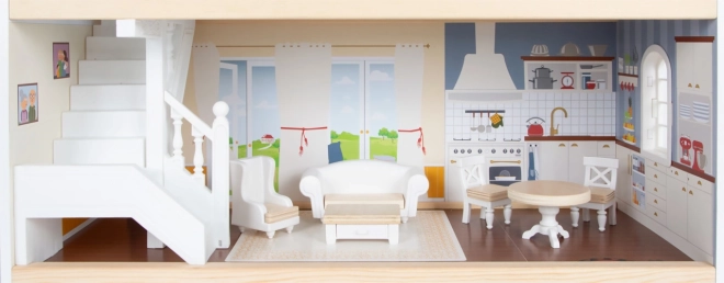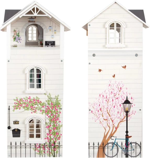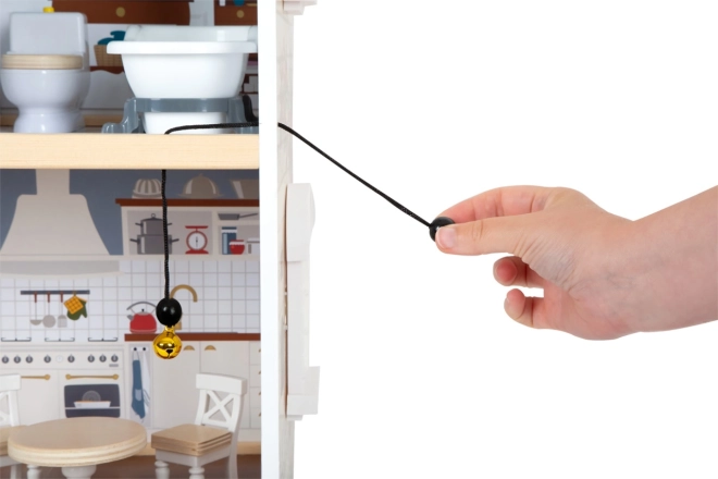 Az olyan részletek, mint a működő csengő, a tolóajtók, a nyitható ablakok és a fiókos éjjeliszekrény növelik a játék realisztikusságát és interaktivitását. A fa- és műanyag elemeket tartalmazó bútorzat a csomag része, ami fokozza az autentikus játékélményt.