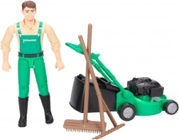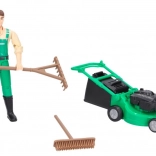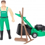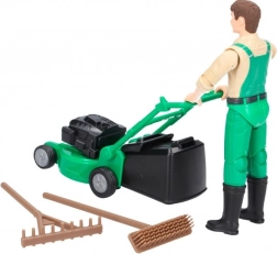 A BRUDER BWORLD Kertész fűnyíróval készlet valósághű pázsitgondozós játékélményt nyújt. A figura ízületes végtagokkal és a szerszámok biztos megfogására kialakított kezekkel rendelkezik, így könnyedén tolhatja a fűnyírót, gereblyézhet vagy seperhet.