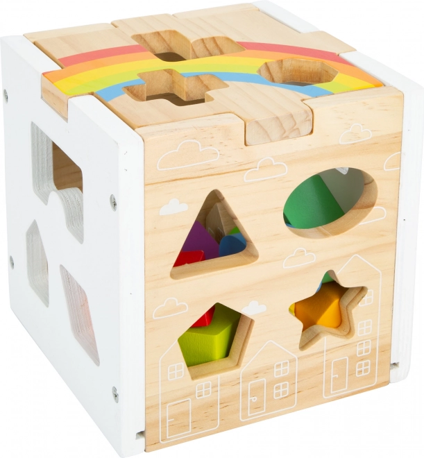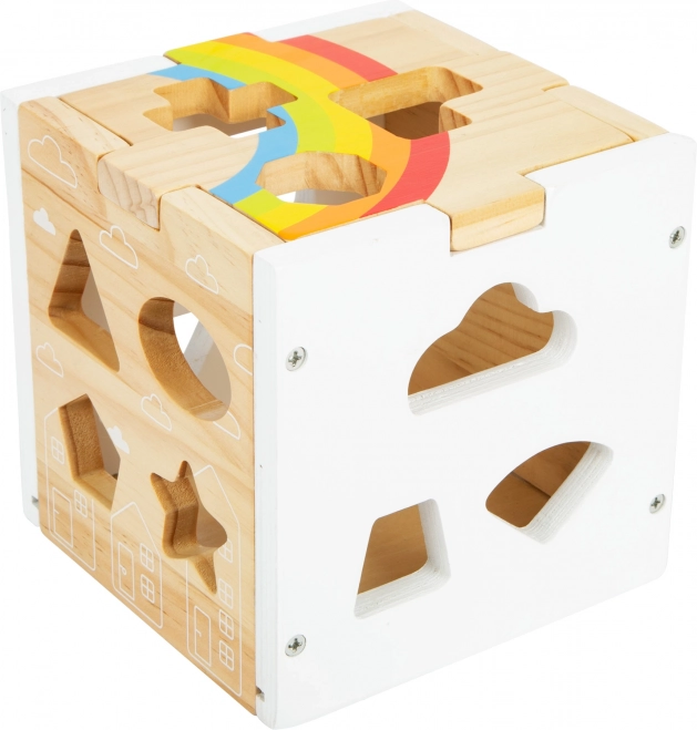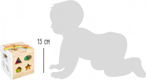 Ez a modern, SMALL FOOT fa bedobó kocka letisztult, természetes fa megjelenésével, fehér panelekkel és színes elemekkel tűnik ki. A gyerekek a nyílásokba olyan formákat helyeznek, mint kör, csillag, háromszög, kereszt, felhő vagy házikó, így játékosan fejlesztik finommotorikájukat és logikus gondolkodásukat.