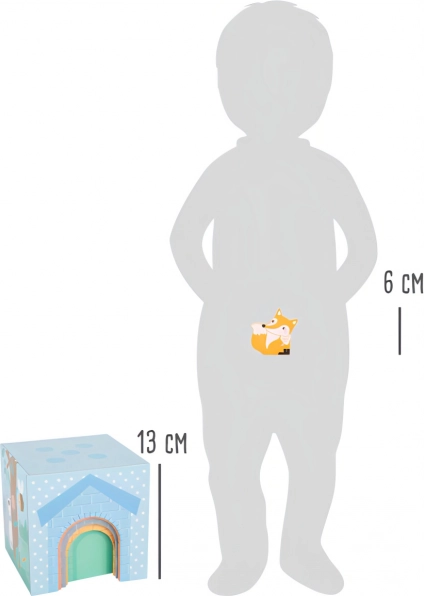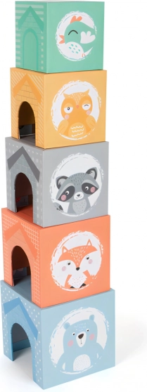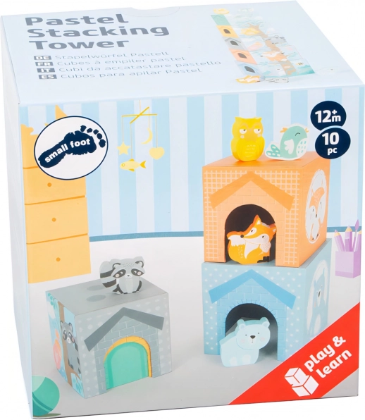 A „Pastell” rakosgató torony masszív kartonkockákat kombinál fa állatfigurákkal, modern pasztell dizájnban. Minden kockaoldal útmutatást ad a helyes sorrendhez, így a gyerekek játék közben tanulnak válogatni és fejlesztik térbeli tájékozódásukat. Az ablakoknak és ajtócskáknak köszönhetően az állatkák „beköltözhetnek” a kockákba, ami ösztönzi a fantáziát és a szerepjátékot.
