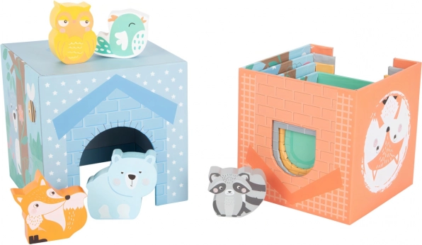 A kockákból magas tornyot lehet építeni, vagy egymásba lehet őket illeszteni. Az ablakok és ajtócskák bújócskára hívnak az állatkákkal, fejlesztve a fantáziát és a finommotorikát.