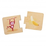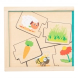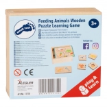 Tanulj és szórakozz! ezzel a fából készült logikai játékkal, mely megtanítja gyermekednek, melyik állat mit eszik. Puzzle, memóriajáték és párosító játék egy csomagban.