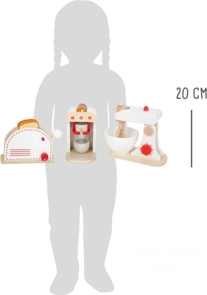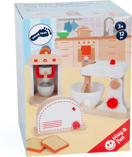 Ez a stílusos fa készlet három legnépszerűbb készüléket hoz a gyerekkonyhába: kenyérpirítót, kávéfőzőt és mixert. A valósághű funkciók, mint a kattintható vezérlők, a kenyérpirító kiugró karja és a mixer forgó habverője, ösztönzik a fantáziát, az önálló játékot és a finommotorika fejlődését.