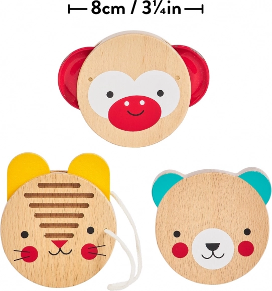 Három egyszerű, állatmintás ütőhangszer támogatja a természetes ritmusérzék kialakulását és az örömteli zenélést már egészen kicsi kortól.