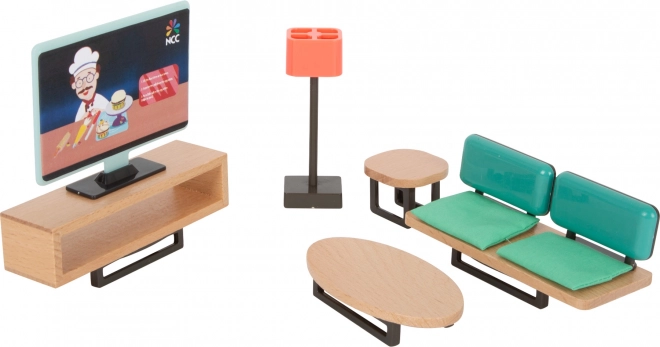 Stílusos kanapé, asztalka és tévé alkotják a ház otthonos központját. Ideális történetmeséléshez és a képzelet fejlesztéséhez.