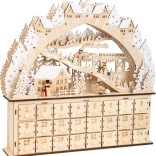Éld át a karácsony varázsát ezzel a fából készült adventi naptárral, amely egy festői falut jelenít meg! A részletek, mint a havas házak, fák, síelők és hóember minden nap örömet okoznak. A naptár fiókjait kis ajándékokkal vagy édességekkel töltheted meg a gyerekek számára.