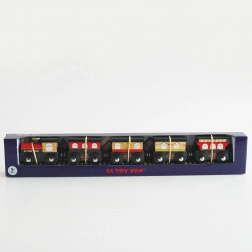 A stílusos ROYAL EXPRESS fa vonat a Le Toy Vantól örömet okoz gyerekeknek és szülőknek egyaránt. Mozdonyt és öt kocsit tartalmaz mágneses kapcsolattal, fenntartható fából készült, és vízbázisú, nem mérgező festékekkel van festve. Támogatja a finommotorikát, a képzeletbeli játékot, és kompatibilis a legtöbb fa vonatpályával.