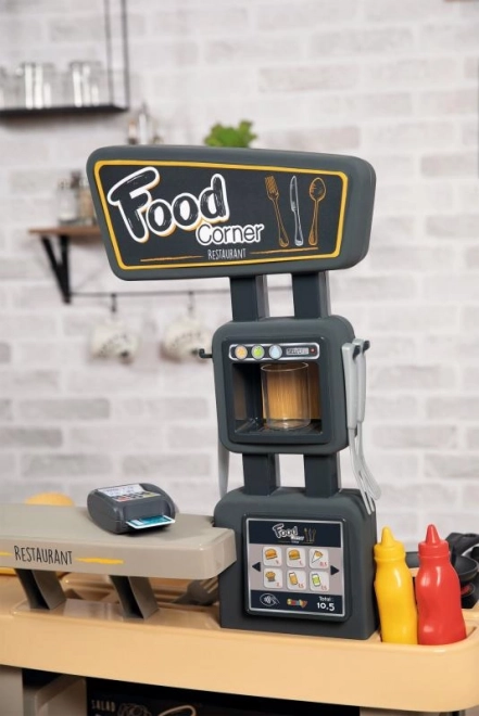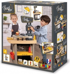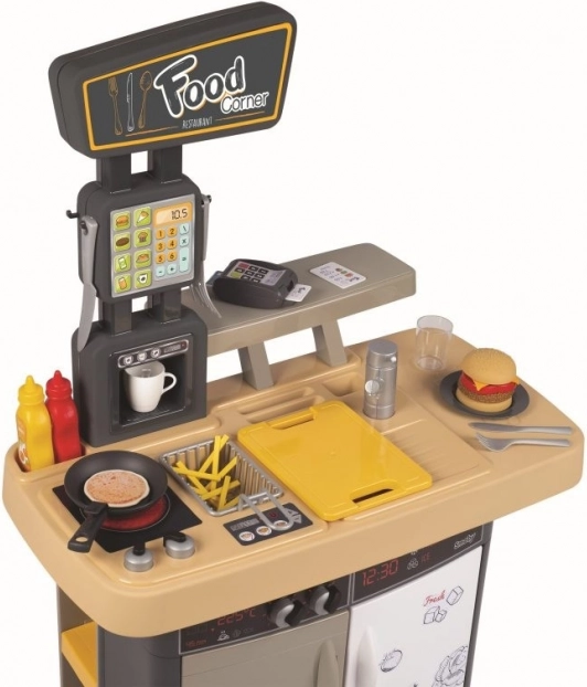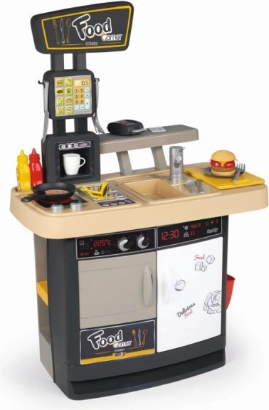 Nyiss saját kis gyorséttermet! A Smoby Food Corner 2 az 1-ben a márkától konyhát és kiadópultot kombinál pénztárgéppel. A gyerekek burgert, hasábburgonyát vagy palacsintát készíthetnek, és közben a pultnál kiszolgálhatják a vendégeket – pont úgy, mint egy igazi étteremben.