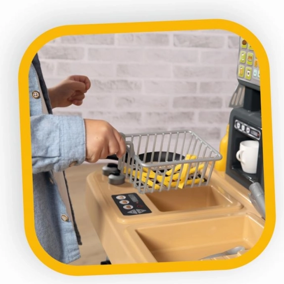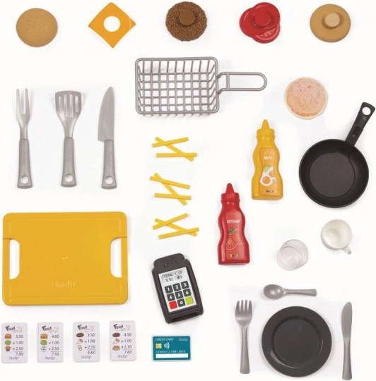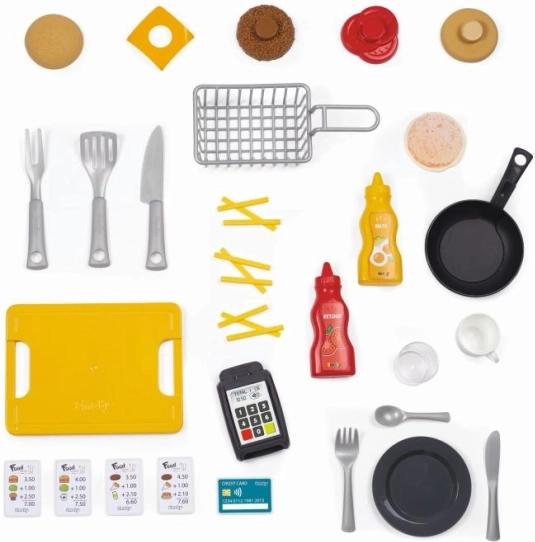 A készletet a sok részlet teszi vonzóvá: főzőlap, fritőz, csappal ellátott mosogató, sütő, hűtő, italadagoló, kávéfőző és akasztók a konyhai eszközöknek. Nem hiányzik a fizetési terminál, a blokkok, a hitelkártya és a nyomtatott menü sem. Játék után a maradékok „kidobhatók” a kukába. Összesen 29 kiegészítő támogatja a változatos szerepjátékokat és a finommotorika fejlődését.