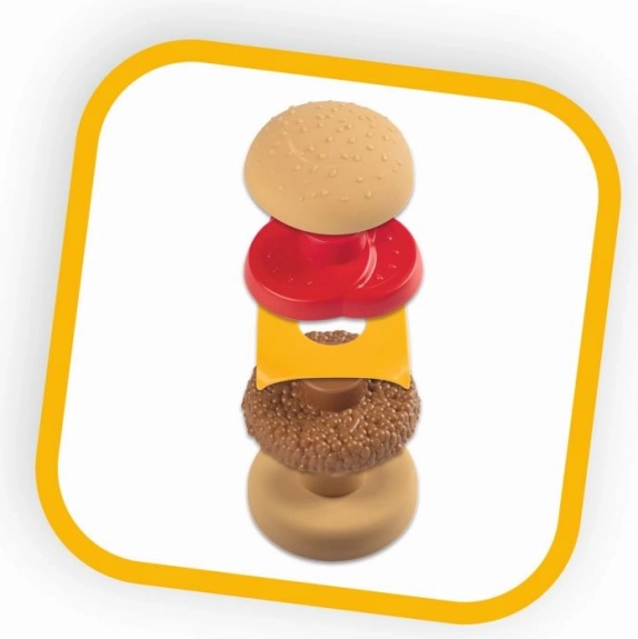 29 db: serpenyő, vágódeszka, tányér, evőeszközök, pohár, bögre, kosár, konyhai eszközök, burger, hasábburgonya, színt váltó palacsinta, szószok, blokkok, hitelkártya stb.