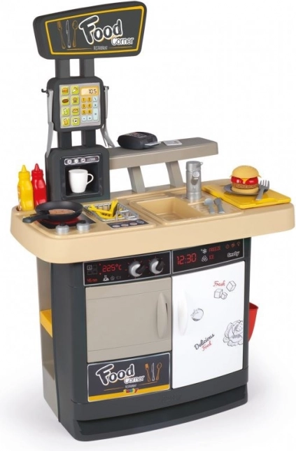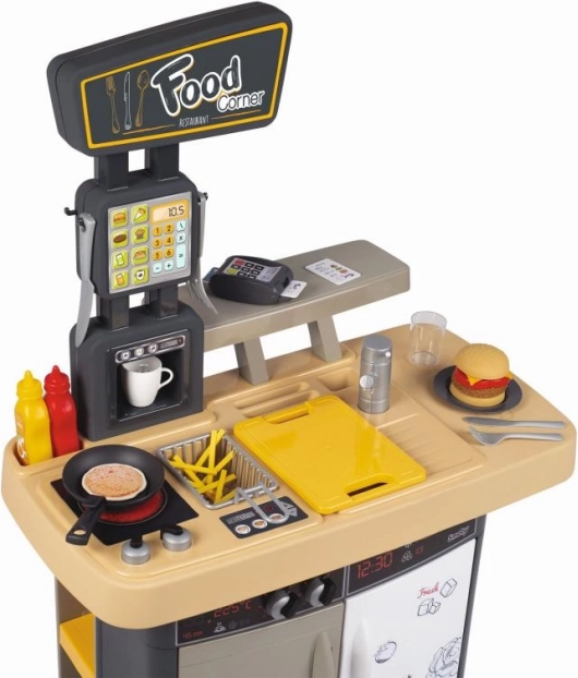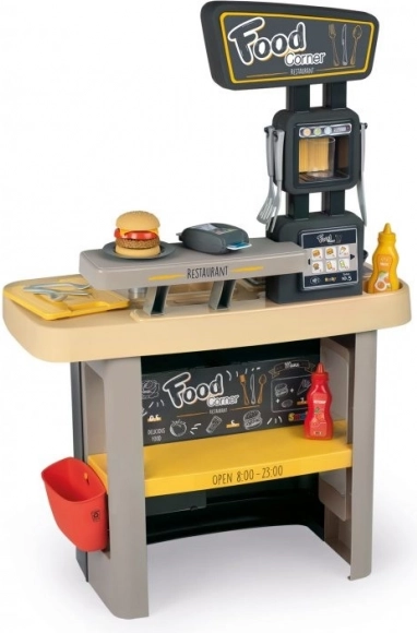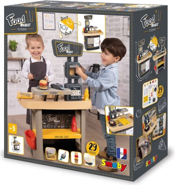A Smoby Food Corner 2 az 1-ben gyerek szett egy kis étteremmé változtatja a szobát főző- és kiszolgáló zónával. Kínál realista funkciókat, gazdag tartozékkészletet (29 db), pénztárgépet fizetési terminállal és menüt az ételek kiválasztásához – ideális a fantázia, a kommunikáció és az együttműködés fejlesztéséhez.