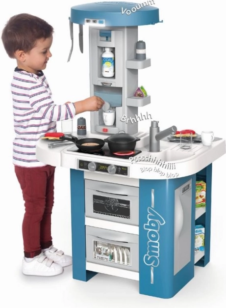 A konyhai lap modern elektronikus főzőlappal van felszerelve, amely két főzési hanggal és piros fénnyel szimulálja a valódi főzést. Az interaktív kávéfőző újratölthető tartállyal utánozza a kávékészítés folyamatát, míg a szagelszívó három zajszintet és világítást nyújt.