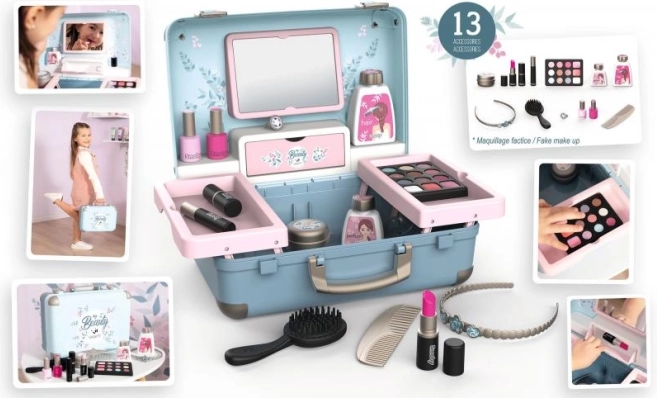 Fedezd fel a szépségszalon játék varázsát a My Beauty Vanity kozmetikai bőrönddel. Ez a gyönyörű és funkcionális bőrönd 13 kozmetikai termék utánzatát tartalmazza, mint például rúzsokat, körömlakkokat, szemhéjpúdereket, szempillaspirált és továbbiakat. Nem hiányzik a fésű, hajpánt és különféle üvegcsék sem.