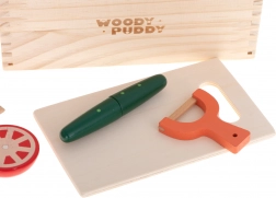 A szett kiváló az önálló játékhoz és a közös főzéshez a szülőkkel: támogatja a kéz–szem koordinációt, a szókincs fejlesztését (ételek, részek nevei), valamint a kreatív szerepjátékot. Az esztétikus fa ládika segít rendet tartani és gyors elpakolást tesz lehetővé.