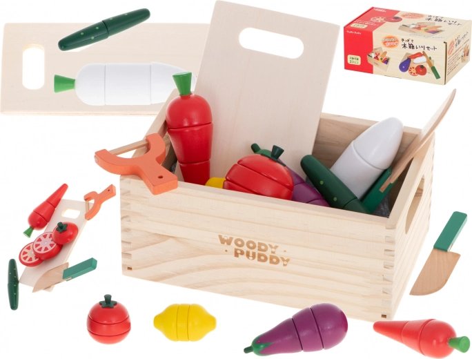 - répa, petrezselyem (retek), uborka, paradicsom (szeletekkel együtt), citrom, padlizsán, vágódeszka, biztonságos kés, biztonságos hámozó, fa ládika