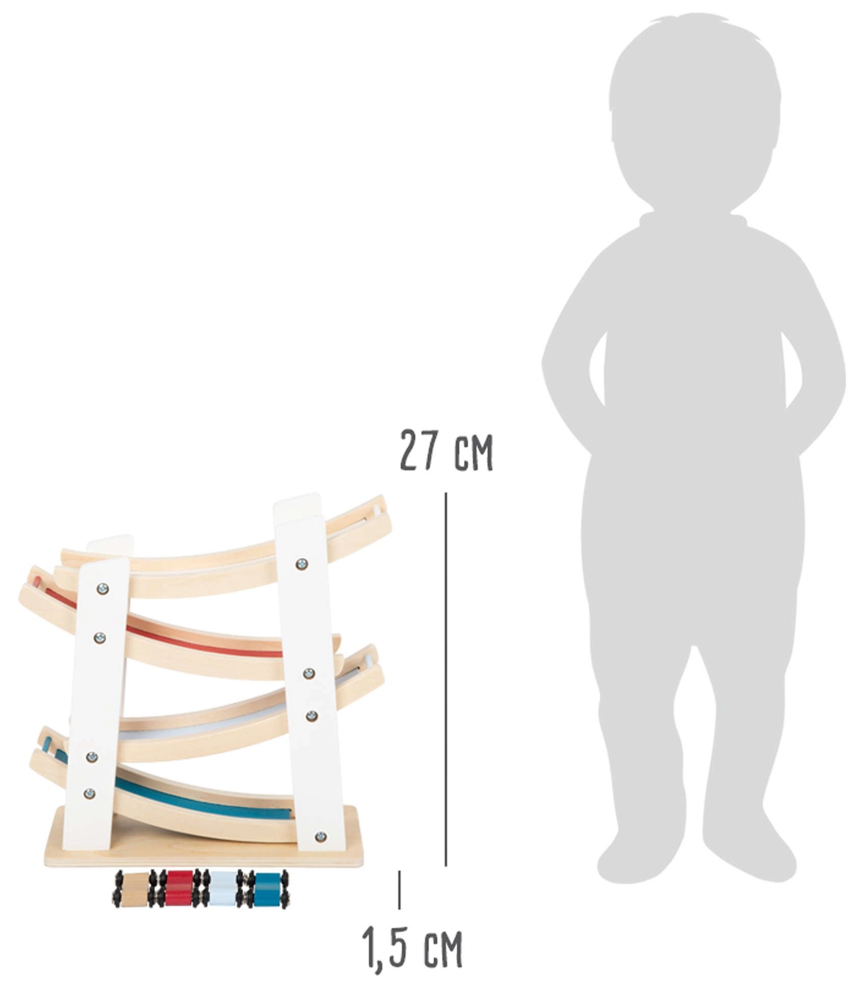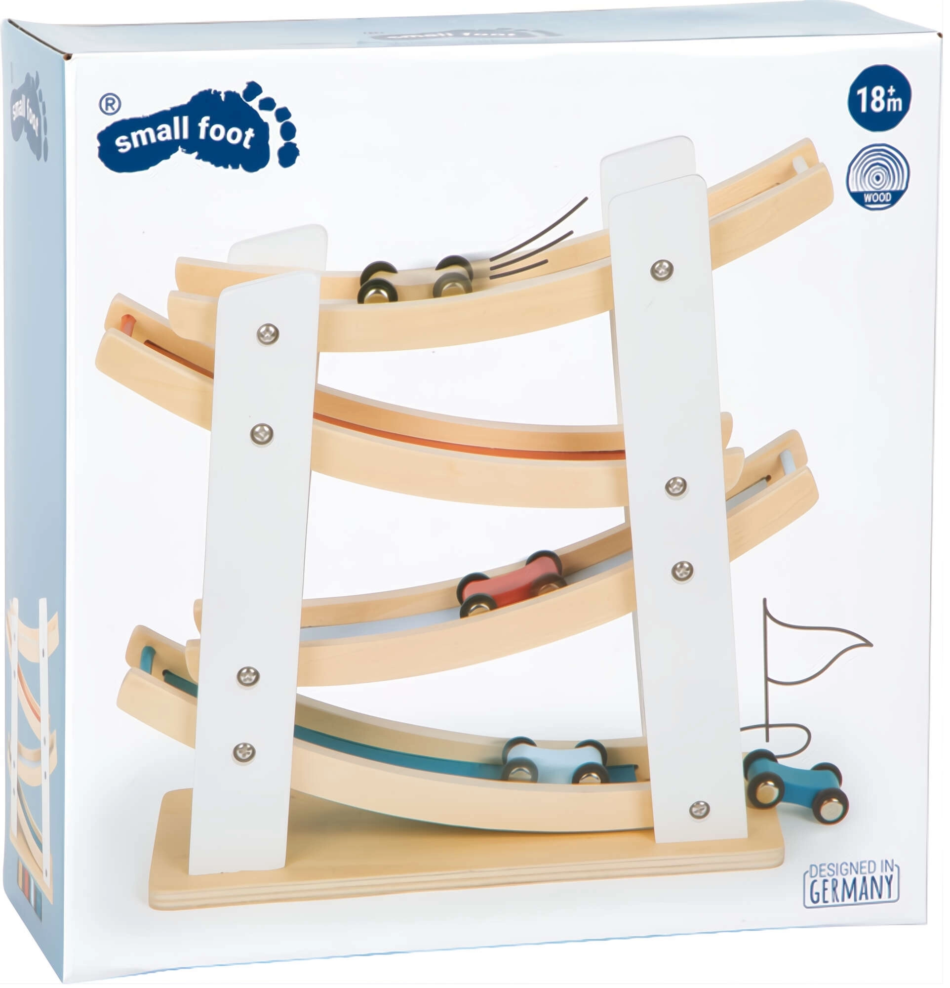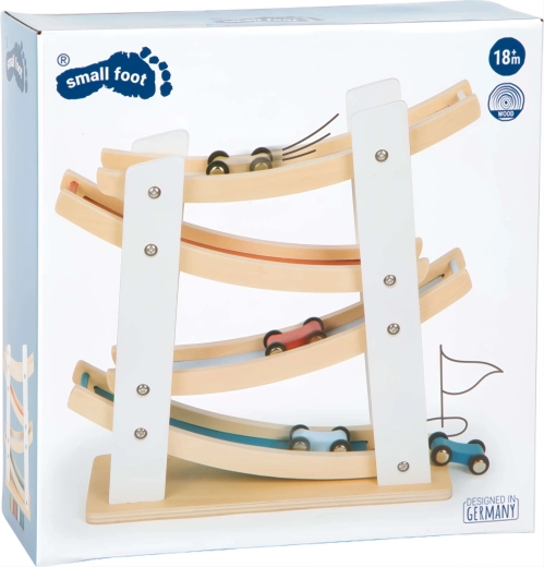Fedezze fel a legkisebbeknek szánt szórakozást a Small Foot fa versenypályájával és kisautóival! A természetes fából készült masszív kivitel, a négy színes kisautó és a sima, kaszkádos rámpákon való suhanás fejleszti a finommotorikát, a szem–kéz koordinációt és az ok–okozati összefüggések megértését. Ideális játék 18 hónapos kortól a mindennapi kreatív játékhoz.