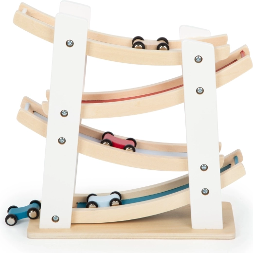 Ez a minőségi fa pálya egyszerű elven működik, amit a gyerekek imádnak: helyezze a kisautót a legfelső szintre, és figyelje, ahogy fürgén lesiklik a kanyarokon egészen az aljáig. A stabil alap és a sima felületek biztonságos és tartós használatot garantálnak.