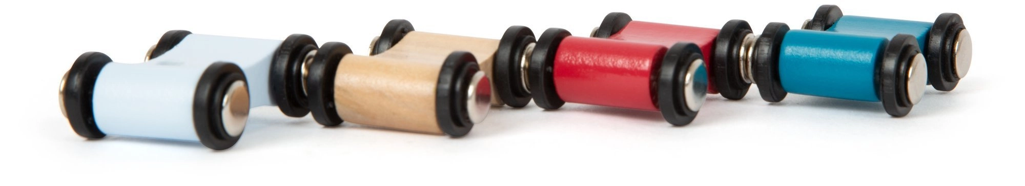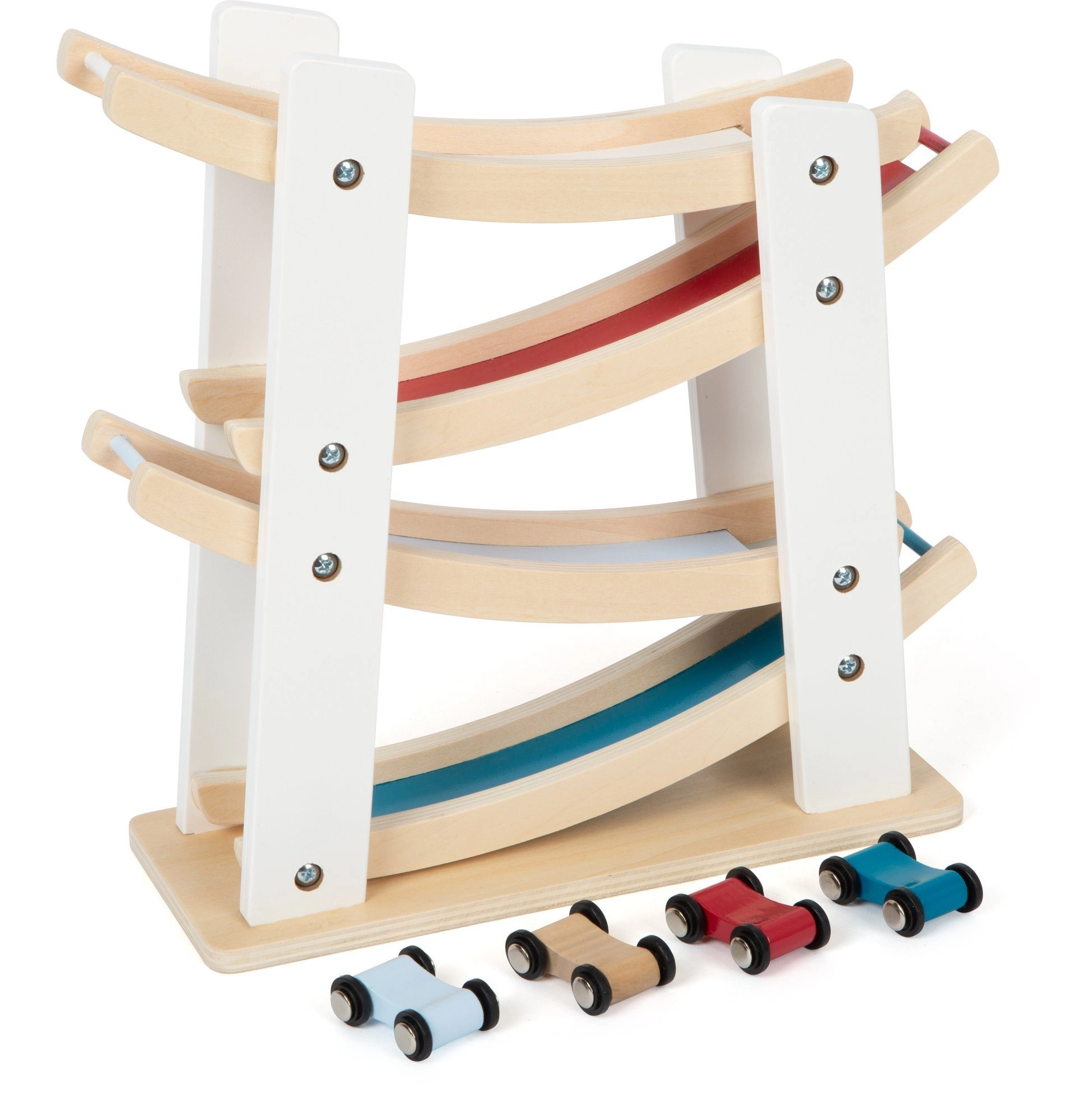 A csomag tartalmaz egy komplett pályát és 4 kisautót különböző színekben. Az időtálló, természetes megjelenés színes csíkokkal könnyedén illeszkedik a gyerekszobába, és támogatja a koncentrációt valamint a felfedezés örömét.