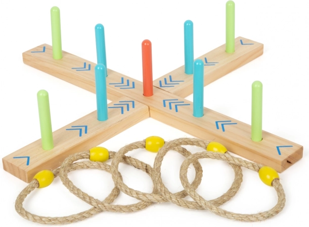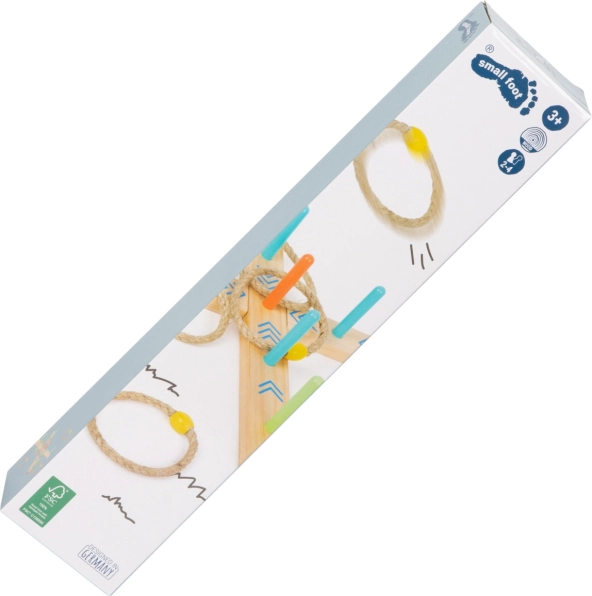 A karikadobás szórakoztató családi játék, ami javítja a készségeket és a koordinációt. A talapzat 100% FSC4 tanúsítvánnyal rendelkező fából készült, amely biztosítja a fenntartható és környezetbarát alapanyagokat. A színes nyilaknak köszönhetően a gyermekek könnyen számolhatják a pontokat, anélkül hogy ismernék a számokat. A csomagolás tartalmaz egy hordozható pamut zsákot az egyszerű tárolás érdekében.