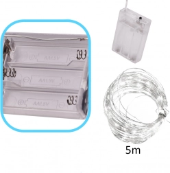 Varázsoljon otthonába meghitt hangulatot a finom, vékony dróton futó, 5 m hosszú LED-füzérrel, 50 hideg fehér diódával. A elemes tápellátásnak köszönhetően konnektor nélkül is bárhová elhelyezhető, ideális karácsonyi dekorációhoz, üvegekbe, palackokba, vagy romantikus hangulatvilágításnak egész évben.