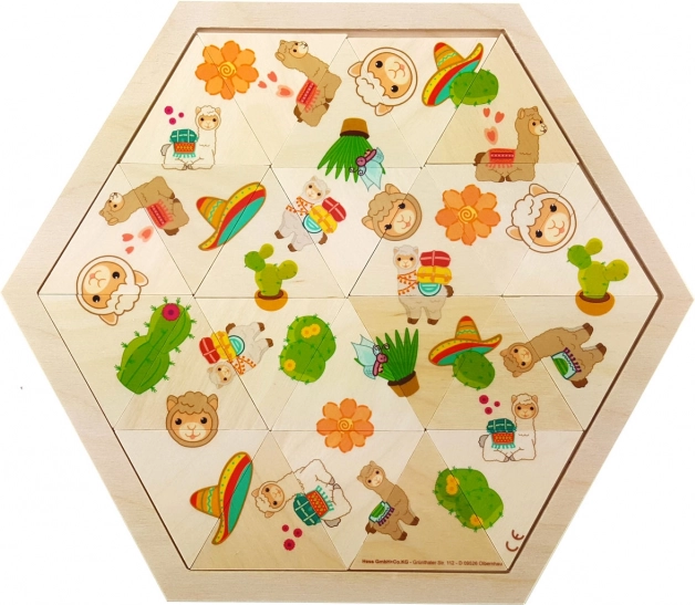 Szórakoztató fa mozaik láma motívummal 3 éves kortól. Tartalmaz 24 színesen nyomtatott elemet egy praktikus fa keretben. Támogatja a finommotorikát, a koncentrációt, valamint a megfigyelés, összehasonlítás és motívumok párosításának készségeit.