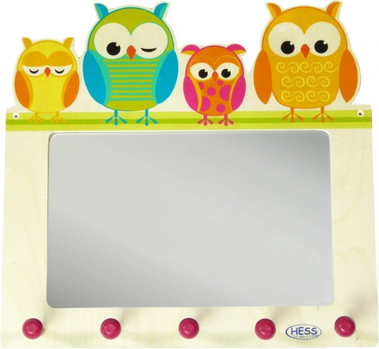 Ez a színes, bagolycsalád motívummal díszített fogas feldob minden gyerekszobát vagy előszobát. Öt akasztóval van felszerelve, amelyek elegendő helyet biztosítanak különféle ruhadarabok és kiegészítők felakasztásához. A törhetetlen plexiből készült tükör biztonságos és praktikus.