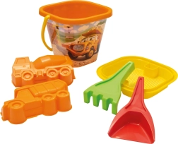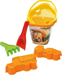 Vödör, lapát, gereblye, szita, 2 forma (teherautó, betonkeverő)