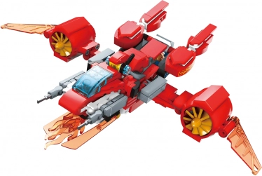 A futurisztikus, piros vadászgép részletes kabinnal, hajtóművekkel és „tüzes” elemekkel minden küldetéshez sebességet és izgalmat ad.
