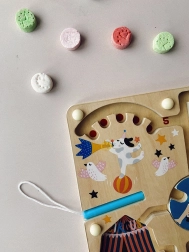 A VILAC mágneses labirintusa 2 éves kortól a cirkusz világát hozza el a gyerekeknek Michelle Carlslund lágy színeiben. A mágneses varázstollal a golyókat pályákon terelgetik, találkoznak akrobatákkal, állatokkal és bohócokkal, a végén pedig minden golyót a megfelelő helyre vezetnek a színe és száma alapján. A játék természetes módon fejleszti a koncentrációt és a türelmet.