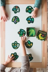 Edzd a megfigyelőképességedet dinókkal! Ez a kártyajáték akár ötféle szabályváltozatot kínál, és tele van színes, dinoszauruszos illusztrációkkal. Biztosan gyorsan megszereted a kompakt mérete miatt is, így otthon és utazás közben egyaránt ideális. Fémdobozban, műanyag felhasználása nélkül csomagolva. Főbb jellemzők: 2–6 játékos számára, 5 szabályváltozat, praktikus csomagolás. Játékszabály: Alapváltozat: Ossz ki minden játékosnak egy lapot képpel lefelé. A felcsapott paklit tedd a játékosok közé. A megbeszélt jelre a játékosok felfordítják a lapjaikat. Aki először bemondja az azonos szimbólumot a saját lapján és a pakli tetején lévő lapon, az elveheti a pakliról a kártyát. Így a pakli végül elfogy, és a legtöbb lappal rendelkező játékos nyer. Fordított változat: Oszd szét a lapokat a játékosok között úgy, hogy mindenkinek ugyanannyi jusson, és egy lap maradjon meg. A játékosok a saját paklijukat maguk elé teszik képpel lefelé. A megmaradt, képpel felfelé fordított lapot tedd középre. A megbeszélt jelre mindenki felfordítja a saját paklija felső lapját. Aki először bemondja az egyező szimbólumot a saját lapján és a középen lévő lapon, az ráteszi a lapját a középen alakuló kupacra, és azonnal felfordítja a következő felső lapját. A játék addig tart, amíg az utolsó játékosnál lapok maradnak – ő lesz a vesztes. Aki elsőként szabadul meg az összes lapjától, az a győztes. Csoportos változat: Menetekben játszódik. Minden menetben minden játékos egy-egy lapot kap képpel lefelé. A jelre mindenki felfordítja a lapját, és aki megnevez és bemond egy azonos szimbólumot a saját lapján és egy másik játékos lapján, annak a játékosnak adja a lapját. A játék addig folytatódik, amíg egy játékos be nem gyűjti az adott menetben kiosztott összes lapot. A cél megszabadulni a lapoktól; az a játékos, aki összesítésben a legtöbb lapot kapja, veszít. Csomag mérete: 10×10,5×5 cm Kor: 4+ Anyag: fém, papír Darabszám: 31 db