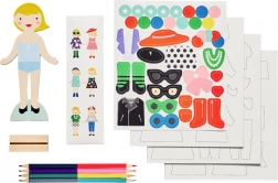 A játék tartalmaz egy mágneses figurát faállvánnyal, 36 mágneses ruhadarabot, 4 kétoldalas ceruzát és 35 matricát, ami több mint 100 különböző összeállítási lehetőséget biztosít. A gyerekek kifejezhetik kreativitásukat és fejleszthetik képzelőerejüket a darabok sokféleségének és a kombinálási lehetőségeknek köszönhetően. A doboz nemcsak tárolóként, hanem kellemes háttérként is szolgál a játékhoz, így az élmény teljes körű és esztétikus.
