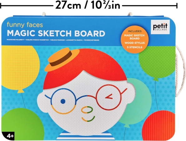 Ez a rajztábla kompakt mérete 27x19x1 cm, és tartalmaz egy könnyen használható ceruzát, amely madzaggal a táblához van rögzítve. A törlőrendszer és a sablonok segítségével a gyerekek könnyen új alkotásokat varázsolhatnak az ötleteikből!