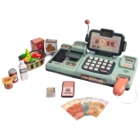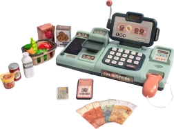 A készlet része a pénztár mérleggel, terminállal, számológéppel, szkennerrel és sok kiegészítővel, beleértve a játék okostelefont és különféle műanyag élelmiszereket.