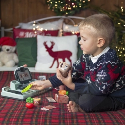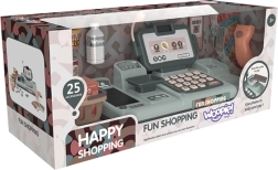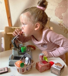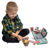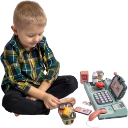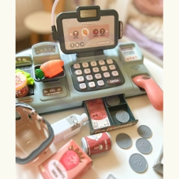 A pénztár tartalmaz egy terminált, amely lehetővé teszi a gyermek számára, hogy készpénzben, kártyával vagy okostelefonnal fizessen, akárcsak a felnőttek a boltban. Az integrált mérleg és mozgatható szalag lehetővé teszik a gyermek számára, hogy szervezze a vásárlást, és megélje az igazi eladó szerepét.