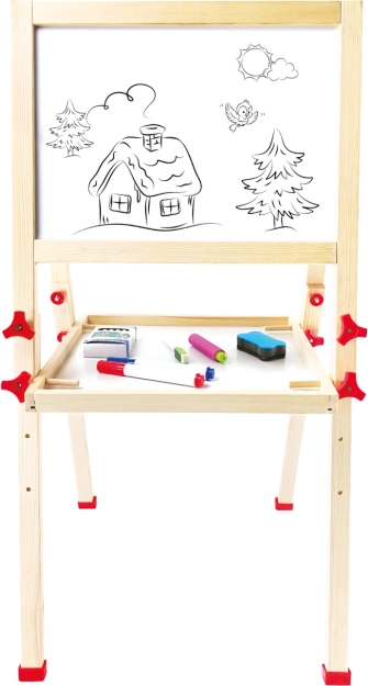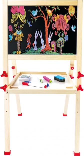 Ez a minőségi gyerektábla ötvözi a fehér, mágneses felületet képek rögzítéséhez és filccel íráshoz a klasszikus palatáblával, amely krétás rajzoláshoz ideális. A magasságállításnak és a stabil fa szerkezetnek köszönhetően együtt nő a gyerekkel, és kiválóan illik gyerekszobába vagy játszósarokba.